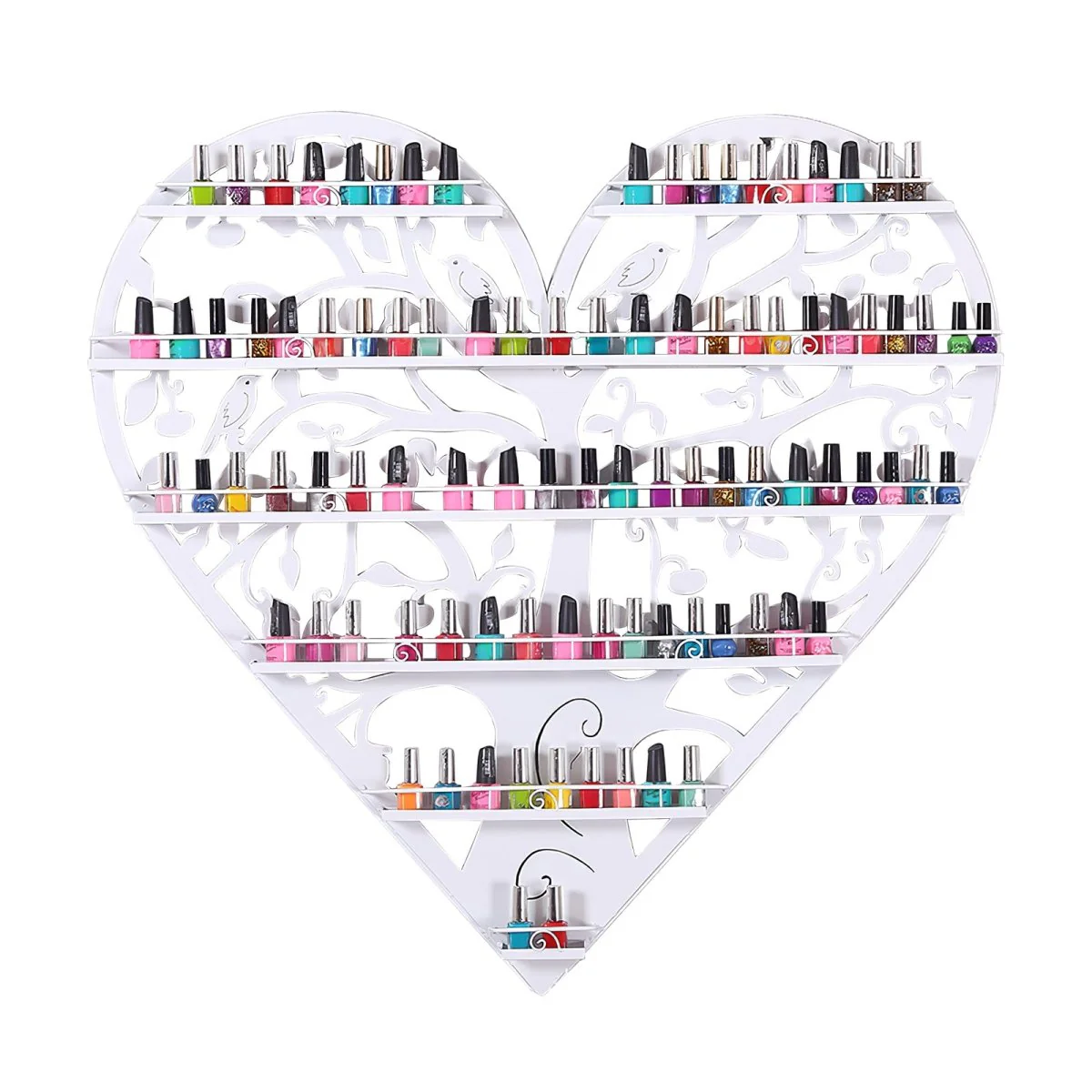 - FEATURE: This heart-shaped rack, featuring an intricate Bird and Tree silhouette is the ultimate nail polish holder to display style and organization to your wall of choice.Easy to install in your home or place of business. Holds up to 70 nail polish bottles.
